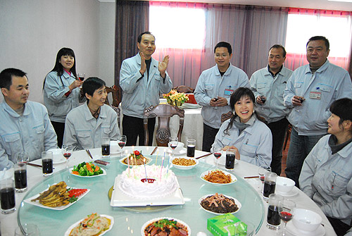 公司堅(jiān)持人性化管理,把員工的利益作為頭等大事。為增強(qiáng)員工的凝聚力,讓員工感受到公司大家庭的溫暖與關(guān)懷,自今年開(kāi)始,公司為所有員工在每周一集中為當(dāng)周生日的員工舉辦生日聚會(huì),慶祝生日。在元月10日的生日酒會(huì)上,公司后勤部精心準(zhǔn)備了8個(gè)涼菜、8個(gè)熱菜、生日蛋糕、水果和紅酒,點(diǎn)燃生日蠟燭,唱起生日快樂(lè)歌。公司領(lǐng)導(dǎo)和各部門(mén)領(lǐng)導(dǎo),也來(lái)到生日聚會(huì)上,一一向過(guò)生日的員工敬酒祝福。公司給員工過(guò)生日,不僅營(yíng)造了和諧的企業(yè)文化,而且也凝聚了人心。參加生日聚會(huì)的員工深受感動(dòng),他們說(shuō),公司為員工過(guò)生日事小意義大,讓我們?cè)谄渲懈惺艿郊彝グ銤鉂庥H情。