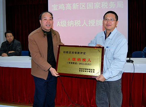 日前,寶雞高新區(qū)國稅局副局長趙文君,監(jiān)察室主任馮超英一行代表陜西省地方稅務(wù)局、陜西省國家稅務(wù)局為為我公司現(xiàn)場頒發(fā)陜西省誠信納稅A級榮譽牌,這是我公司第二次獲此殊榮。
