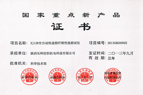 經過申報、省級初審、國家答辯評審,公司自主研發(fā)的XJ128快速棉纖維性能測試儀被認定為2013年度國家重點新產品,同時被列入2013年度國家重點新產品計劃(有效期三年)。公司獲得由國家科技部、環(huán)保部、商務部及質檢總局聯合頒發(fā)的“國家重點新產品證書”,同時作為擇優(yōu)對象獲得新產品研發(fā)補助。